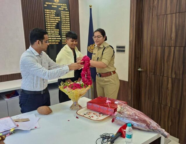 एसपी अगम जैन ने पुलिस अधीक्षक कार्यालय में बहन क्रांति गौड़ को पुष्पगुच्छ भेंट कर सम्मानित किया तथा उनके उज्ज्वल भविष्य एवं श्रेष्ठ प्रदर्शन के लिए शुभकामनाएं दीं।