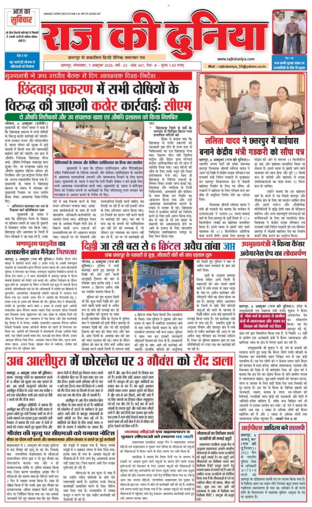 Home डेली न्यूज़ राज की दुनिया छतरपुर 7 अक्टूबर 2025 डेली न्यूज़ राज की दुनिया छतरपुर 7 अक्टूबर 2025 By admin - October 7, 2025 17 0 FacebookTwitterWhatsAppTelegram
